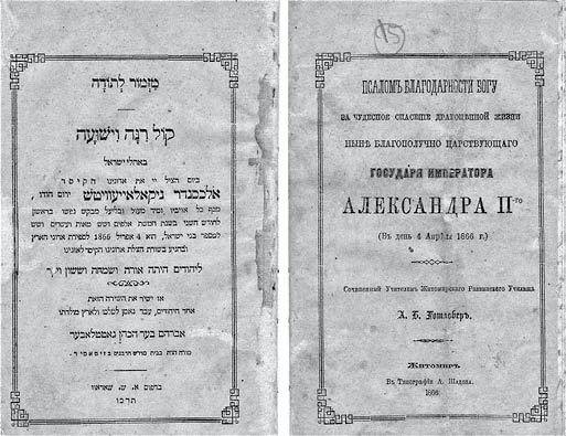 Яркой иллюстрацией взглядов на взаимоотношения с государством стала реакция представителей еврейского мира, его разных религиозных направлений на попытки революционеров расправиться с царем Александром II. Примером можно считать «Псалом благодарности Богу на чудесное спасение драгоценной жизни ныне благополучно царствующего государя Александра», написанный Авраамом Готлобером[77]. Отметим, что автор столь необычного для еврейской культуры текста сам прошел путь от симпатии к хасидизму (пусть и по семейным соображениям) к участию в борьбе с ортодоксальным иудаизмом в качестве сторонника Гаскалы. В момент покушения Дмитрия Каракозова на царя в 1866 году Авраам преподавал Талмуд в житомирском училище. Поддерживавший политику даже жесткого по отношению к евреям царя Николая I за его реформы в области еврейского образования и тем более приветствовавший либеральный курс Александра II, Готлобер был, безусловно, искренним, когда создавал этот текст, поэтому не стоит винить его за излишнюю патетику.