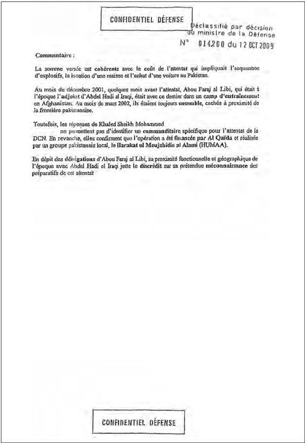 Это двухстраничное донесение, составленное 9 сентября 2005 года, было рассекречено 12 октября 2009 года, в рамках расследования теракта в Карачи 8 мая 2002 года, унесшего жизни одиннадцати французских служащих Дирекции по строительству военных кораблей (DCN).