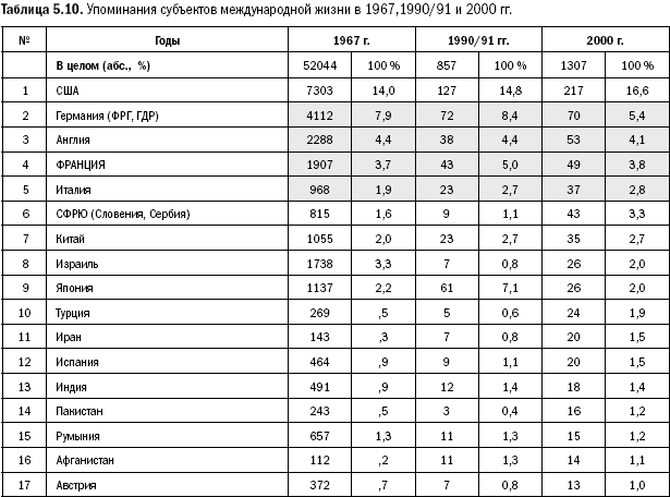 Таблица 5.10 дает удельный вес частот упоминания стран мира в указанных каналах за 33 года. Здесь следует целый ряд фактов, которые можно выделить только на сопоставлении динамических рядов, так как статическая картина позволяет делать принципиально иные выводы.