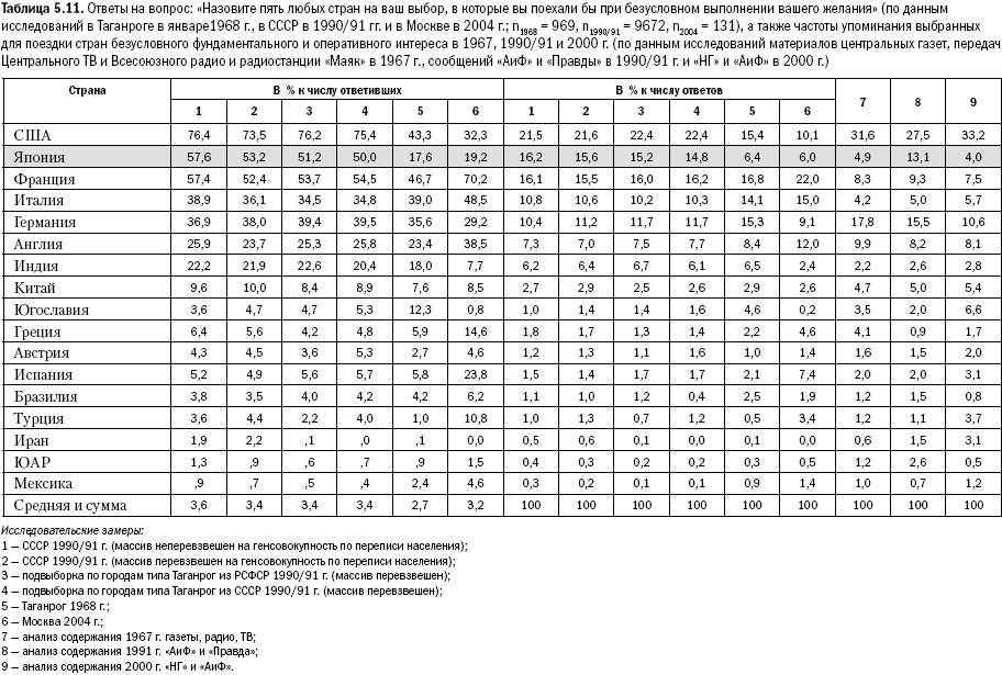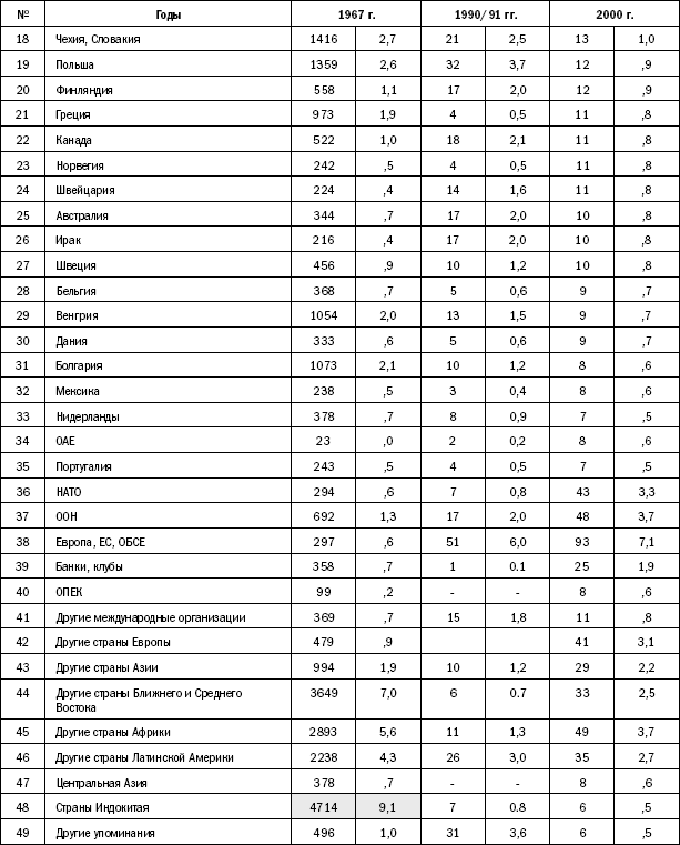 Вот как расположились частоты упоминаний различных стран мира в центральных и областных газетах, каналах радио и ТВ за 1967 г., в «АиФ» и «Правде» в 1990/91 гг. и в «АиФ» и «Независимой газете» во время выборной президентской кампании 2000 г.[125]
