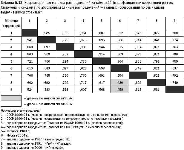 2. Точки равновесия и флуктуаций. Если убрать из информационного ряда упоминания США, столь «любимых» нами и необходимых нам в решении вопросов внутренней политики (что, кстати, по сути дела верно, но является результатом откровенной славяно-англосаксонской «взаимности» на протяжении всего послевоенного периода), то довольно устойчивыми окажутся упоминания тех европейских стран, интерес к которым у населения не претерпел изменений за четверть века. СМИ не могут выйти из тех форм обыденного сознания общества, о которых они в то время не знали[129]. В таблице 5.11 взяты, во-первых, данные об интересе людей к 15 (тем же, что и на рис. 5.3) странам в исследованиях 1968 г. в Таганроге, 1990/91 гг. в СССР и 2004 г. в Москве, во-вторых, упоминания этих стран в информационных рядах 1967, 1990/91 и 2000 гг., в-третьих, данные по всем упомянутым параметрам по США и Японии. Они рассмотрены как в границах страны в целом, так и в границах городов типа Таганрог и на различных модификациях массива 1990/91 г. для иллюстрации принципиального сходства данных. Если теперь сделать ранговую корреляцию всех девяти приведенных рядов по 17 отобранным странам, мы увидим принципиальные сходства и различия в целом, изменения в зависимости от оперативных обстоятельств и устойчивые и меняющиеся «зоны» интереса населения к странам мира и освещения их СМИ. Здесь отдельно выделяется ряд явлений: