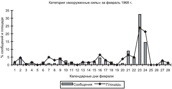 4. Кампанейский характер освещения международной жизни, свойственная, как и материальному производству, «штурмовщина» при производстве сообщений. Здесь в табл. 5.11 в 1967 г. выпадают в доминирующие группы страны Индокитая, в 1990/91 г. Афганистан и «удаляющаяся от нас» Польша, в 2000 г. Югославия и балканские страны. По завершении конфликта удельный вес упоминаний резко падает, а иногда та или иная, заслужившая внимание в конфликтной ситуации страна и вовсе исчезает с «карты мира» в «совокупном сознании» и тексте коммуникатора. Подобный «способ производства» известен давно, и не только относительно освещения международной жизни. Уже в 1968 г. на материалах центральных и местных печатных и аудиовизуальных СМИ были обнаружены одно-двухдневные «скачки» внимания к определенным фрагментам реальности, которые можно интерпретировать как «прокукарекал, а дальше хоть не рассветай». На рис. 5.11 приводится распределение частот сообщений, содержащих категорию «вооруженные силы» в ростовском «Молоте» и «Таганрогской правде» за февраль 1968 г. Анализ содержания имел предметом более 10 000 сообщений областных и городских газет, радио, ТВ как на международные, так и на внутренние темы[130]. Здесь очень хорошо видно практически полное соответствие площади и частоты сообщений по указанной теме, а также полное ее забвение уже через день после юбилейной даты 50 лет Советской Армии.