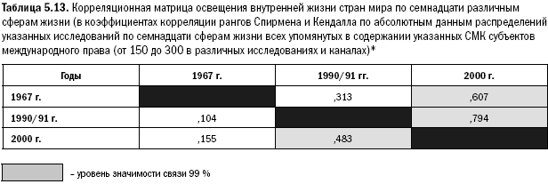 Мы рассмотрели корреляцию пластов содержания за 1967,1990/91 и 2000 гг. по 17 сферам жизни всех освещаемых зарубежных стран (промышленность, экономика, финансы, торговля, спорт, политика и т. д. и т. п.). Результаты представлены в табл. 5.13.