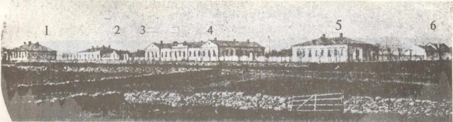 1. Поликлиника 2. Дом врача 3. Въездные ворота, сторожка 4. Лечебный корпус с операционным залом 5. Дом врача 6. Хоз. службы