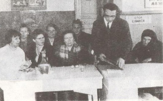 Главврач больницы Александр Николаевич Нагирнюк поздравляет лекпома Полину Абрамовну Кальман с 60-летним юбилеем (в первом ряду справа — врач-терапевт Галина Андреевна Бродовая, слева — бывшая операционная сестра Г.П.Корсун).