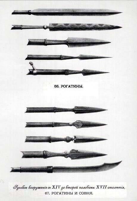 Копье. Длинная палка с железным наконечником называется копье. Это было основное оружие наших воинов и они им владели виртуозно. Если копьем можно только колоть, то было другое оружие которым можно было и колоть и рубить. Оно называлась рогатина. У нее наконечник был длиньше и шире и острее заточен если с двух сторон, то это просто рогатина, а если с одной, то эта рогатина называлась совней или пальмой. Раз ей приходилось рубить и фехтовать с противником, то для этого на рогатине делали гарду, поперечную перекладину, а чтобы парировать продольный удар в лезвии сверлили дырочки и туда вставляли кольцо. Бьет враг саблей или топором, а вы подставляете наконечник рогатины. Если удар попадает на кольцо, то оно проворачивается и изменяет линию атаки. Сабля уходит в сторону. Вот такое нехитрое, но очень эффективное приспособление.