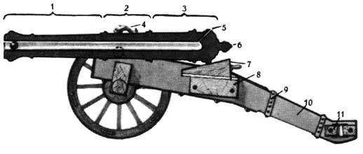 1 – дульная часть, 2 – вертлюжная часть, 3 – казенная часть, 4 – дельфин, 5 – запальное отверстие, 6 – винград, 7 – подъемный клин, 8 – подклиновая подушка, 9 – оковка, 10 – станина лафета, 11 – хоботовая подушка, 12 – Дуговой прицел, 13 – поддон.