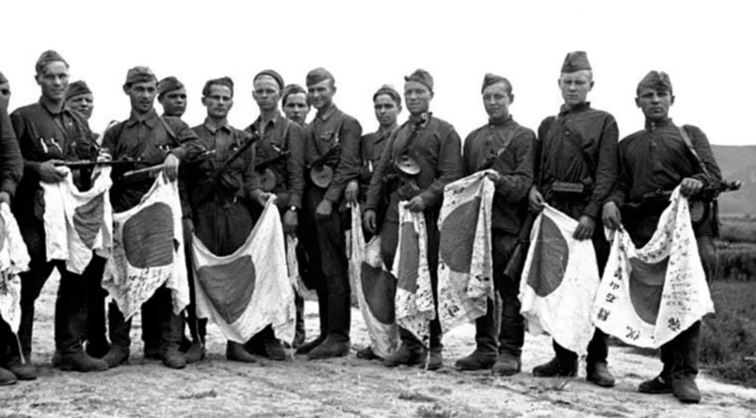 Разведчики 6-й гвардейской танковой армии с захваченными японскими знаменами. Август 1945 г.