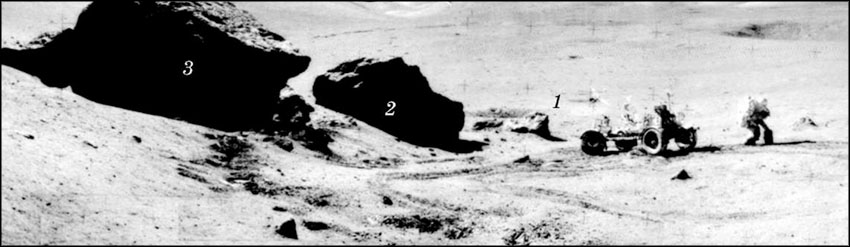 Посмотрите на «панораму Луны» на рис. 9. Внизу видны следы в мокром грунте. (Кстати, его нужно было смачивать и потому, что в пыли были бы видны лучи осветительных прожекторов.) В центре слева направо три камня, «Лунаровер» и астронавт. Сначала посмотрите, как освещены эти три камня, которые мы пометили цифрами в кружках. Первый (самый дальний), второй, стоящие возле них машина и астронавт освещены слева и отбрасывают тень вправо. А камень № 3 освещен справа, и тень дает влево. Солнце так не освещает, так могут осветить только прожектора.