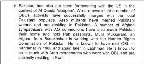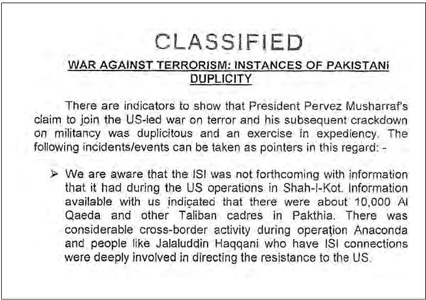 Этот секретный двухстраничный документ был составлен британскими разведывательными службами для их американских и европейских коллег. И здесь приводится длинный список улик, доказывающих двуличие пакистанской «Межведомственной разведки» и тлетворные связи, которые она поддерживает с Аль-Каидой и другими радикальными джихадистскими движениями.