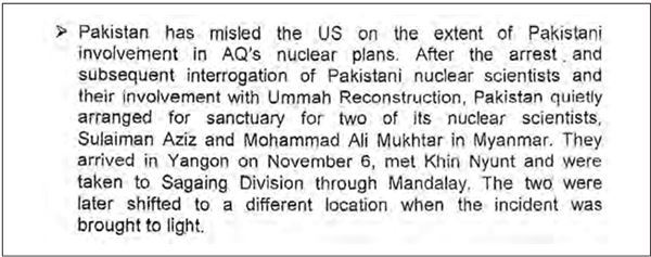 Пакистан ввел в заблуждение США относительно своей вовлеченности в ядерные проекты Аль-Каиды. Пакистанские власти сначала арестовали своих ученых-ядерщиков, в ходе допросов которых выяснилось их участие в проекте «воссоздания всемирной исламской общины (уммы)», но затем двое из них, Сулейман Азиз и Мохаммед Али Мухтар, были освобождены, и им было предоставлено тайное убежище в Мьянме. Они прибыли в Янгон 6 ноября, их принял глава военной разведки страны Кхин Ньюн, а затем они отправились в Сикайн через Мандалай. Каждый из них затем был перевезен в другое место, когда об их пребывании в Мьянме стало известно.