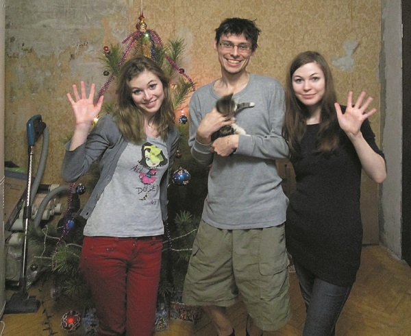 Внизу: Последний Новый год Антона в России, 31 декабря 2012 г. Антон с Машиными сестрами Аней и Сашей и котом Бобром, который потом окажется кошкой.