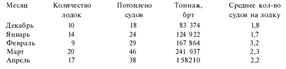 Общий итог патрулирования шестнадцати подводных лодок VII серии, направленных в апреле к берегам Соединенных Штатов, составил 33 потопленных судна (из них 7 танкеров), а также пять парусных судов и рыболовных траулеров общим тонна около 158 200 тонн.