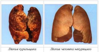 Посмотрите наглядный пример различия между лёгкими курильщика (слева) и лёгкими человека, который не курит (справа):