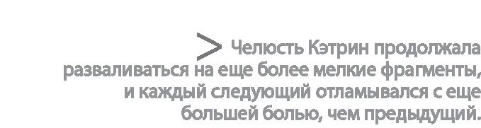 Хотя подруги и старались всячески ее поддержать – Олив принесла фрукты и ведро свежих яиц, а Перл купила ей новенькую ночную сорочку, ради которой им с Хобартом пришлось пожертвовать своими скудными средствами, – тело Кэтрин отказывалось реагировать на их доброту. Она страдала от мучительных непрекращающихся болей, которые требовали постоянного приема наркотических средств. Ее челюсть продолжала разваливаться на еще более мелкие фрагменты, и каждый следующий отламывался с еще большей болью, чем предыдущий, и с этими новыми переломами в ее состоянии произошло еще одно изменение.