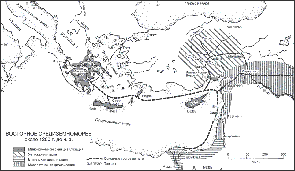 Традиционно считается, что новое греческое племя, названное дорийцами, прорвалось в Грецию с Балкан вскоре после 1200 года до н. э. Археологические источники зафиксировали пожары и разрушение Микен и многих других цитаделей на возвышенностях. Деревни в долинах исчезли, а население во многих областях материковой Греции, похоже, сократилось и жило в жалких разрозненных деревнях, укрытых среди холмов. Другие беженцы устремились на острова, а позднее – и на побережье Малой Азии. Сами дорийцы достигли Крита, Родоса и юго-западной оконечности Малой Азии. Дикая свирепость дорийского вторжения нанесла смертельный удар микенской цивилизации. К 1050 году до н. э. эгейский мир опустился на более примитивный уровень, чем тот, что был известен в течение предыдущей тысячи лет.