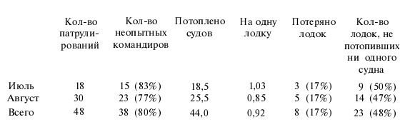 Ниже представлены результаты противоконвойных операций немцев на севере Атлантики силами сорока восьми подводных лодок, вышедших в море в июле и августе. Тридцать восемь из них (80 %) либо впервые вышли в море, либо находились под началом неопытных командиров. Всеми лодками было потоплено сорок четыре судна, что из расчета на одну лодку составило 0,91 судна за одно патрулирование. Двадцать три лодки, — почти половина, — не потопили ни одного судна.