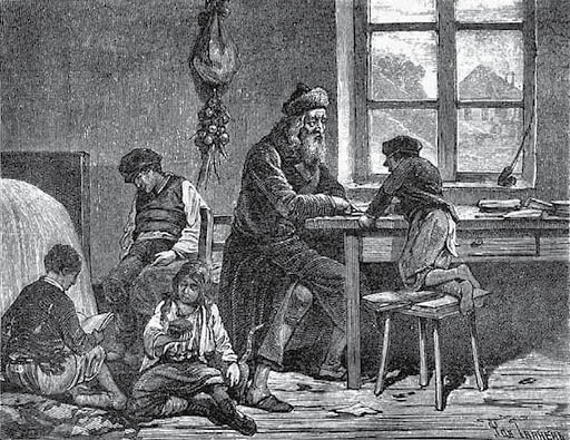 Еврейская школа. Гравюра XIX в. из книги Д.И. Менделеева «К познанию России». 1906 г.