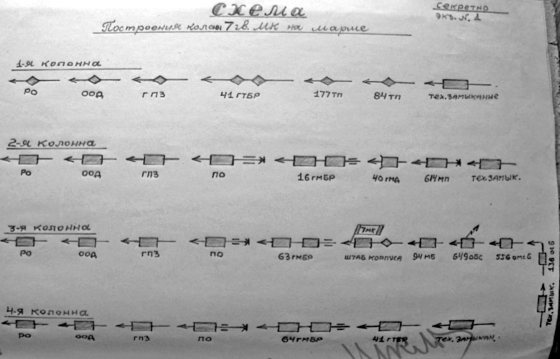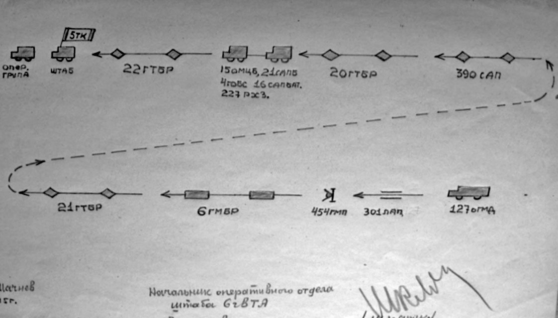 е) шестая колонна – 15-й гв. мцб, 4-й гв. обс, 21-й гв. сапбат, 169-й мсбат; 227-й орхз.