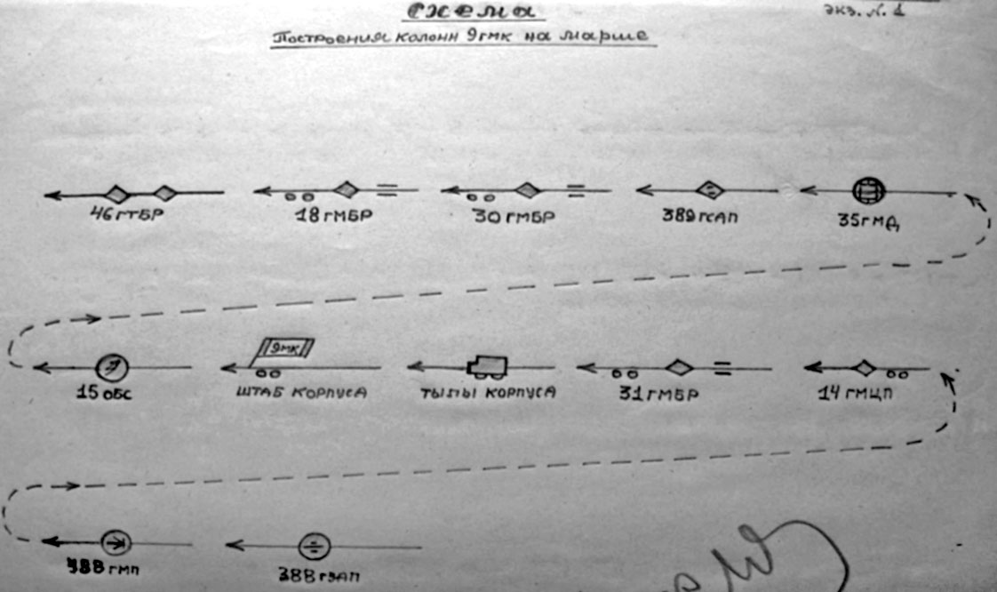 Схема 4. Построение походного порядка 9-го гвардейского механизированного корпуса при совершении марша
