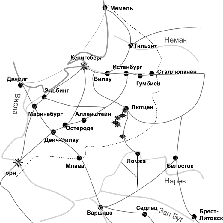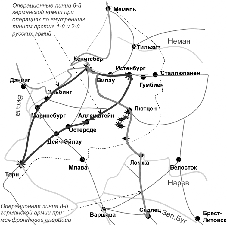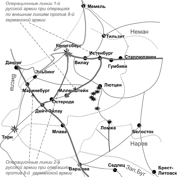 Задача, стоящая перед обеими сторонами в Восточной Пруссии, была очень сложной. Русские армии в принципе не могли организовать нормальное взаимодействие между собой – по крайней мере до овладения Лютценом и лютценской линией укреплений. Да и после этого угроза со стороны Кёнигсберга все время будет «тянуть» 1-ю армию вправо, а угроза со стороны Торна вынудит 2-ю армию сместиться влево, что опять-таки нарушит взаимодействие армий. Понятно, что, пользуясь преимуществом внутренних линий, немцы имеют возможность сосредоточить превосходящие силы против любой из русских армий и разбить ее.