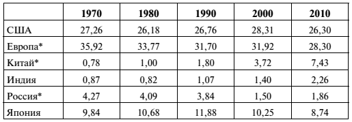 Первым пунктом в списке сильных сторон США идет их общая экономическая мощь. Американская экономика по-прежнему с большим отрывом опережает остальные страны. Только Евросоюзу как экономическому объединению удается слегка вырваться вперед, но при этом западноевропейская модель отличается более высоким уровнем структурной безработицы и более низкими темпами роста. Гораздо существеннее для прогнозов то, что, несмотря на резкий экономический рывок Азии, основная доля в мировом ВВП уже не первое десятилетие принадлежит США (см. таблицу 2.3). 14 триллионов долларов их ВВП за 2010 год составляют свыше 25 % общемировых показателей, тогда как на долю их ближайшего соперника Китая приходится чуть более 9 % мирового ВВП (6 триллионов долларов). По подсчетам Фонда Карнеги, если в 2010 году ВВП Штатов не дотягивает до ВВП Евросоюза на 1,48 триллиона долларов, то в 2050 году ВВП Штатов будет превышать ВВП Евросоюза на 12,03 триллиона, а в цифрах ВВП на душу населения разрыв между Штатами и Евросоюзом увеличится с 12 723 долларов в 2010 году в пользу Америки до 32 266 долларов в ее же пользу в 2050 году.
