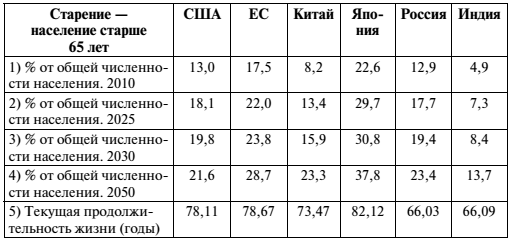 Третье преимущество Америки – относительно крепкая демографическая база, особенно в сравнении с Европой, Японией и Россией. Большая численность населения (318 миллионов человек), несомненно, дает Америке ощутимый глобальный вес. Кроме того, Штатам не приходится переживать из-за демографического старения населения и даже демографического спада, наблюдающегося почти на одинаковом уровне в остальных странах. Согласно прогнозам ООН, к 2050 году население США достигнет 403 миллионов, 21,6 % из которых будут старше 65 лет. За этот период население ЕС уменьшится с 497 до 493 миллионов, 28,7 % из которых перешагнут 65-летний рубеж. Прогноз для Японии потрясает еще больше: численность населения сократится со 127 миллионов в 2010 году до 101 миллиона в 2050 году, 37,8 % из которых будут старше 65 лет к середине века (см. таблицу 2.6).