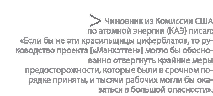 Хотя с Артом все оказалось в порядке, это опасение не было надуманным. В записях Свена Кьяера была подробно описана смерть сестры одной красильщицы циферблатов: она, «как сообщалось, умерла от воздействия радиации, хотя никогда не работала на заводе [USRC]». Источником радиационного заражения, судя по всему, стала ее сестра, красильщица, с которой она спала в одной кровати».