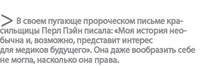 Среди тех женщин, что согласились на обследования ради человечества, встречались и знакомые лица. Одной из них была Перл Пэйн. «Полагаю, мне повезло, – однажды сказала она про то, что ей удалось выжить, – в том, что радий не сосредоточился в одной из костей моего тела, которую нельзя удалить, как это случилось со многими теперь уже мертвыми девушками».