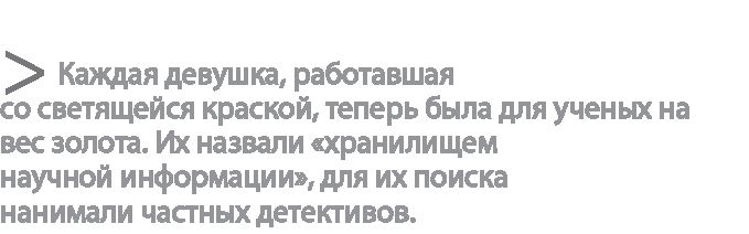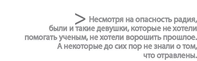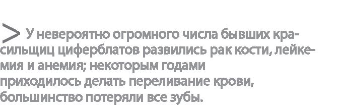 «Когда я была молоденькой девушкой, – рассказывала Шарлотта Перселл, – мне платили кучу денег за то, чтобы я рисовала цифры на настенных и наручных часах. Мы не знали, что краска была ядовитой. После того как я оттуда уволилась, моя подруга Кэтрин Донохью сильно заболела. И очень многие девушки начали тяжело болеть. Яд скопился у меня в руке, однако у моей подруги Кэтрин он распространился по всему телу, и она умерла. Она умерла, и ее муж и дети остались без мамы».