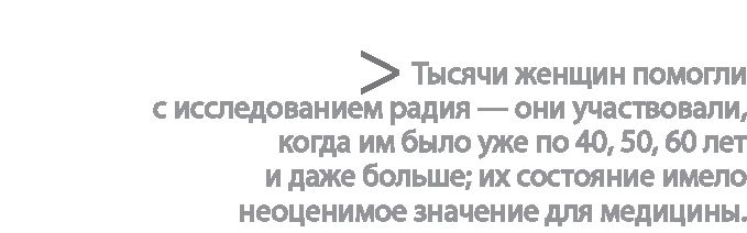 Десятилетие за десятилетием радиевые девушки приходили в ЦРЧ для тестирования. Они давали согласие на проведение биопсии костного мозга, анализов крови, рентгеноскопии, физического осмотра; женщин просили ничего не есть перед посещением клиники и приходить в одежде, которую они смогут «без труда снимать и надевать». Им давали заполнять анкеты для оценки их психического и физического здоровья, у них тестировали дыхание, ну и, конечно, исследователи измеряли уровень радиоактивной нагрузки их организмов в замкнутых металлических помещениях под землей. Даже после смерти, при вскрытии, их тела выдавали секреты, которые ученые не могли узнать при их жизни. Тысячи женщин помогли с этим исследованием – они участвовали, когда им было уже по 40, 50, 60 лет и даже больше; их состояние имело неоценимое значение для медицины. Их жертва принесла пользу нам всем и продолжает приносить каждый день нашей жизни.