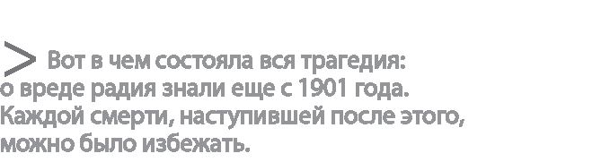 «Каждая семья переживает горе и скорбь, – сдержанно сказала Джин. – Однако смерти Маргариты можно было избежать». Вот в чем состояла вся трагедия. О вреде радия знали еще с 1901 года. Каждой смерти, наступившей после этого, можно было избежать.