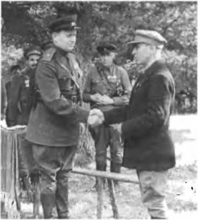 Генерал-майор Т. Л. Строкач награждает партизана. Позади слева — комиссар 1-й Украинской партизанской дивизии генерал-майор С. В. Руднев; справа — зам. начальника Украинского ШПД полковник И. Г. Старинов, (июль 1943 г.)