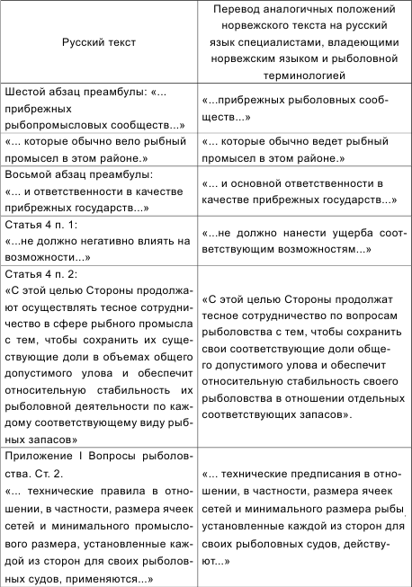 4. Дополнительный сравнительный анализ текстов Договора на русском и норвежском языках, касающихся вопросов рыболовства, показывают отсутствие их аутентичности. Так, даже в преамбуле (6 абзац) в русском тексте «прибрежных рыбопромысловых сообществ» и «… которые обычно вело рыбный промысел…», то в норвежском тексте: «…прибрежных рыболовных сообществ…» и «… которые обычно ведут рыбный промысел…».