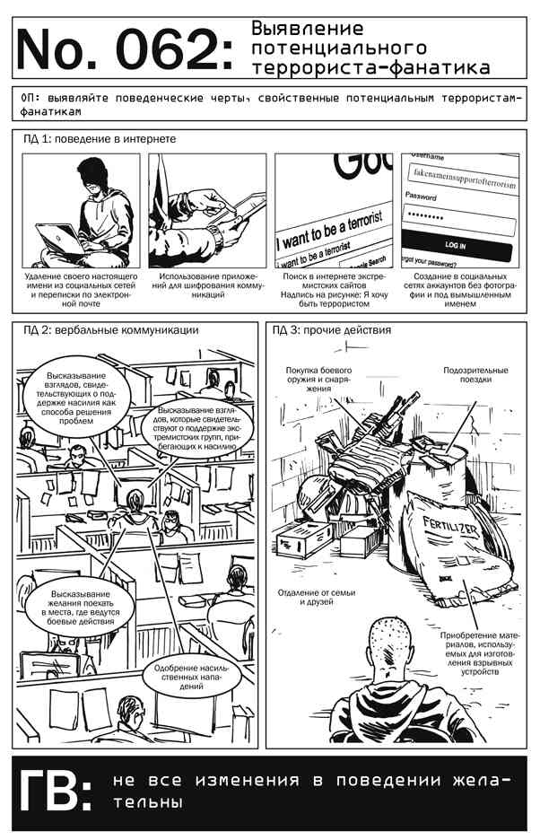 Люди не меняют идеологию в одночасье. К тому же это не происходит незаметно. За преступниками, совершающими теракты, как правило, остается «хвост» — факты, свидетельствующие об эволюции их образа мыслей. Кроме того, люди, у которых происходит кардинальная перемена убеждений, нередко проявляют заметный интерес к обсуждению этих изменений. Они даже могут выдать свой интерес попытками привлечь в число своих сторонников окружающих или способствовать радикализации их взглядов. Поэтому обращайте внимание на подобные сигналы.