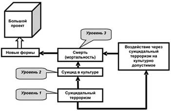 Эти три уровня очевидно связаны между собой. Суицидальный терроризм сопровождает и раскручивает «культуру смерти», волю к смерти. Он призван сформировать новые нормы в обществе. Но (!) новые нормы создают только тогда, когда хотят осуществить новый большой Проект.