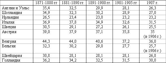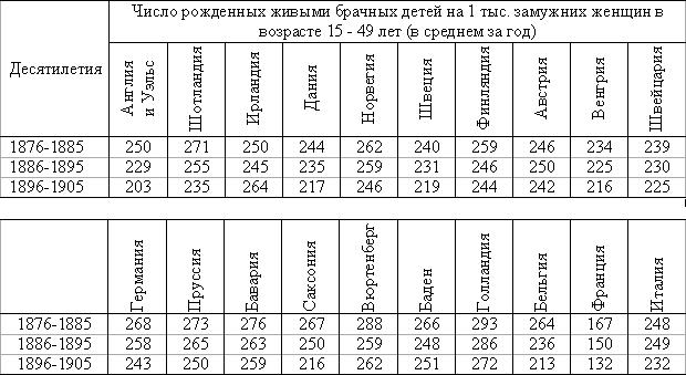 Уменьшение деторождении, следовательно, — явление общее, и, хотя Франция и Ирландия дают наиболее низкие величины, самый процесс уменьшения числа деторождении быстрее всего идет в Англии, Германии (Саксонии) и Шотландии. То же самое явление мы наблюдаем в Соединенных Штатах и Австралии. Еще ярче выступает эта тенденция, если мы вместо общих цифр рождаемости будем рассматривать рождаемость детей в браке, то есть отношение рожденных в браке к среднему количеству замужних женщин, способных к деторождению (в возрасте 15–49 лет):