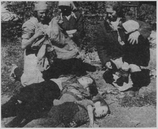 Мешканки Донбасу оплакують загиблих дітей. Кадр із документального фільму О. Довженка «Битва за нашу Советскую Украину» (1943)