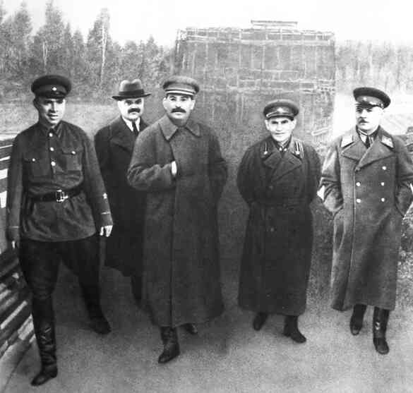 Слева направо: зам. заместитель главы НКВД СССР и одновременно начальник ГУЛАГа М. Д. Берман, И. В. Сталин, председатель Совнаркома СССР В. М. Молотов, нарком внутренних Н. И. Ежов и нарком обороны СССР К. Е. Ворошилов