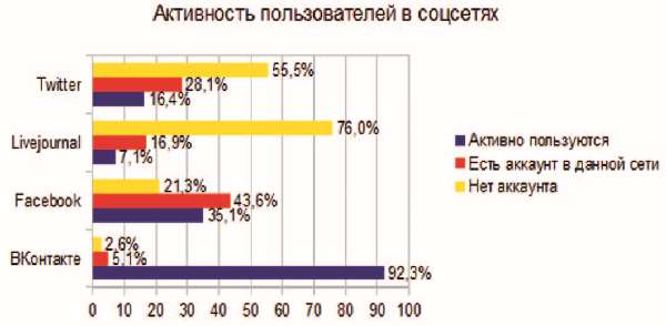 Полученные данные свидетельствуют о том, что в настоящий момент максимальной популярностью пользуются сети с наиболее выраженными коммуникативной и интерактивной составляющими — ВКонтакте и Facebook. Ресурс Livejournal используется наименьшим числом респондентов, почти у 80 % опрошенных вообще нет аккаунта на этой площадке.