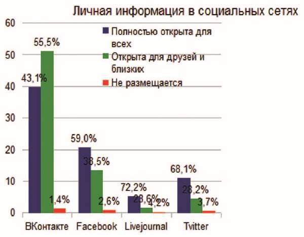 Однако причины такой свободы неоднозначны. Политика, проводимая описываемыми интернет-ресурсами, одна из основных задач которых — социальные коммуникации, предполагает максимальную доступность данных личного профиля пользователя другим пользователям сети. В связи с этим особенно интересным представляется пик, который образует значение «Информация, открытая для друзей и близких» для ресурса ВКонтакте. Данная площадка обладает, пожалуй, наиболее тонкими и дифференцированными инструментами настройки личного профиля, в том числе и конфиденциальности.