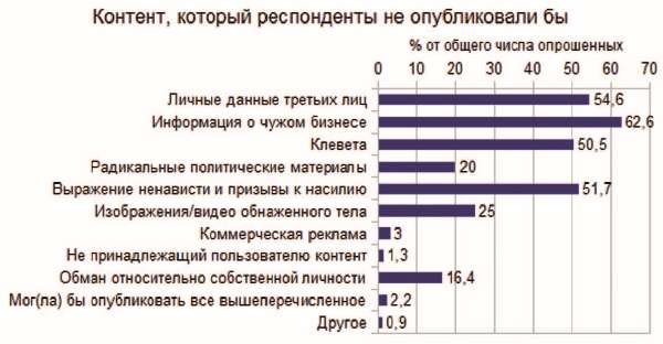 Как видно, ведущими типами контента, который респонденты «никогда бы не опубликовали у себя на странице», оказываются личные данные третьих лиц (54 %), закрытая информация о чужом бизнесе (62,6 %), клевета (50,5 %), выражение ненависти и призывы к насилию (51,7 %).