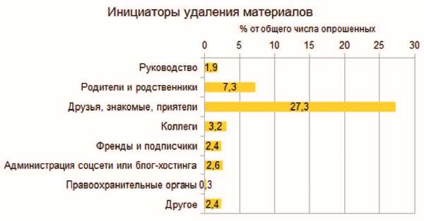 • 34,8 % всех опрошенных заявляют, что им случалось удалять контент по требованию других участников сетевой (или не сетевой) коммуникации.
