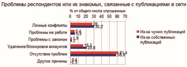 • Более чем у трети респондентов были проблемы (преимущественно личные конфликты) из-за их собственных публикаций в Сети.