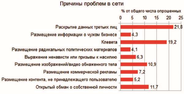 Очевидно, что ядро нарушений сетевых правил и конвенций, повлекших за собой определенные проблемы для респондентов или их знакомых, составляют действия, связанные с приватной информацией о человеке (раскрытие данных третьих лиц — 21,8 %, клевета — 19,2 %). Именно эти нарушения находятся в центре зоны информационного риска, о которой говорилось выше.