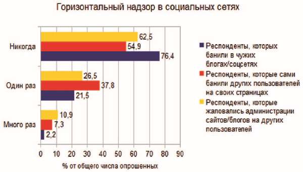 Как мы видим, Сеть регулируется некоторым набором нормативных практик, отчасти внешних для нее (личные конфликты, мнение друзей и близких), отчасти опирающихся на нормативную базу конкретных ресурсов (удаление и блокировка аккаунтов).