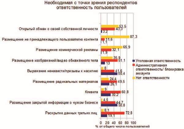 Как видно из диаграммы, по мнению большинства респондентов, наименее тяжкими действиями являются обман о собственной личности, нарушение авторских прав, размещение коммерческой рекламы. В то же время в пользу уголовного наказания большинство склоняется в отношении выражения ненависти и призывов к насилию (50,4 %), а также в отношении размещения информации о чужом бизнесе (50,8 %). 30,2 % респондентов поддерживают уголовную ответственность за клевету!
