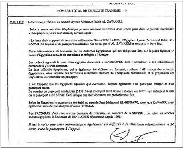 Этот документ объемом в одну страницу был составлен атташе французского посольства в Амстердаме 27 августа 1998 года. Посланный по факсу в Париж, начальнику Координационной группы по борьбе с терроризмом, он передавал сведения, согласно которым, «предполагаемая правая рука террориста-миллионера Усамы бен Ладена», Айман аз-Завахири, путешествовал с французскими, голландскими и швейцарскими паспортами на вымышленные имена – Сами Мохаммед Эль-Хифнави и Амин Отман.