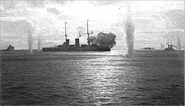 Линейные корабли «Андрей Первозванный» и «Петропавловск» ведут огонь по мятежному форту «Красная Горка». 1919 г.