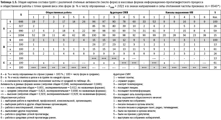 Значения энтропии говорят, что поведение «малоактивного» слоя плотно лежит вокруг информационного приема, где радио в то время на первом месте. При росте активности поведение следующих слоев «распыляется» по всем формам, и энтропия по качественным показателям растет. Однако она остается очень низкой по количественным диапазонам числа используемых форм в каждой из групп по активности[23]. Это значит, что и там и там наличествует оптимальная плотность распределения по формам жизни, но если у малоактивных это вызвано попаданием в ту область социального, где из предлагаемого набора можно использовать только четыре ярко фиксируемые таблицей формы информационного приема, то у высокоактивных это «возгонка» на поля активности, сокращенные вокруг ядра-набора политической деятельности в производственно-управленческом контуре социума.